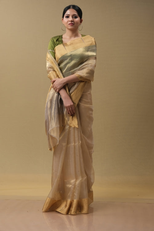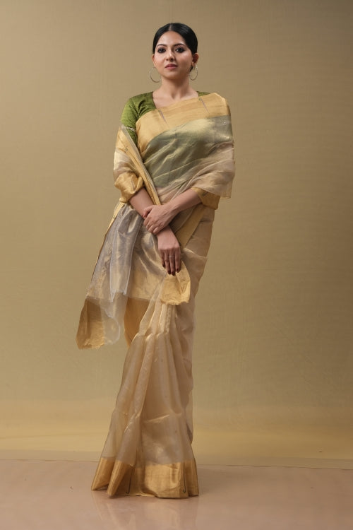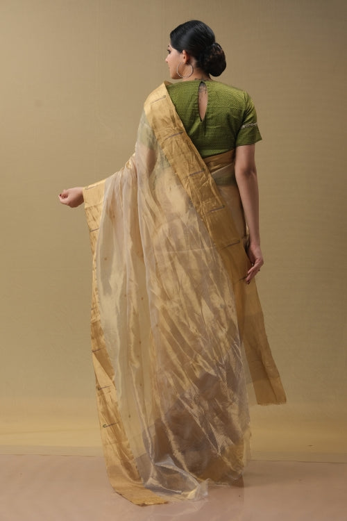 Experience refined elegance with this Golden Tissue Sari, a masterpiece of traditional craftsmanship. Woven from premium tissue fabric, this sari presents a luminous golden palette that exudes understated luxury and timeless appeal. The lightweight, breathable material drapes with effortless grace, offering both comfort and poise for formal occasions and celebrations.