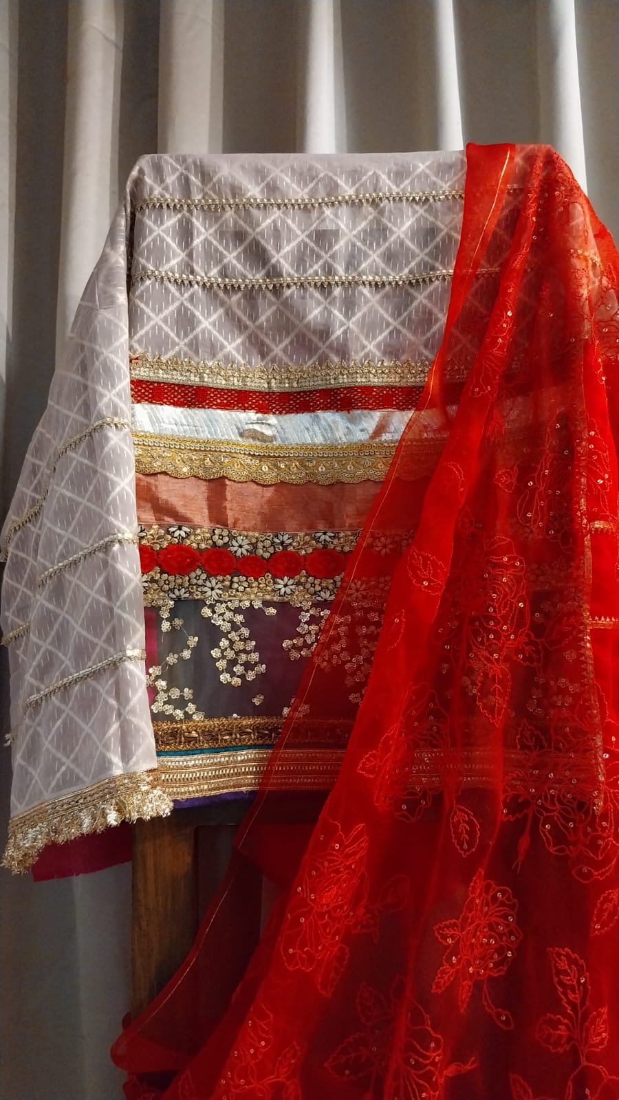 Made out of fine banarasi and chanderi handwoven silk in contrasting colors this unstitched blouse is anew concept in blousing.
