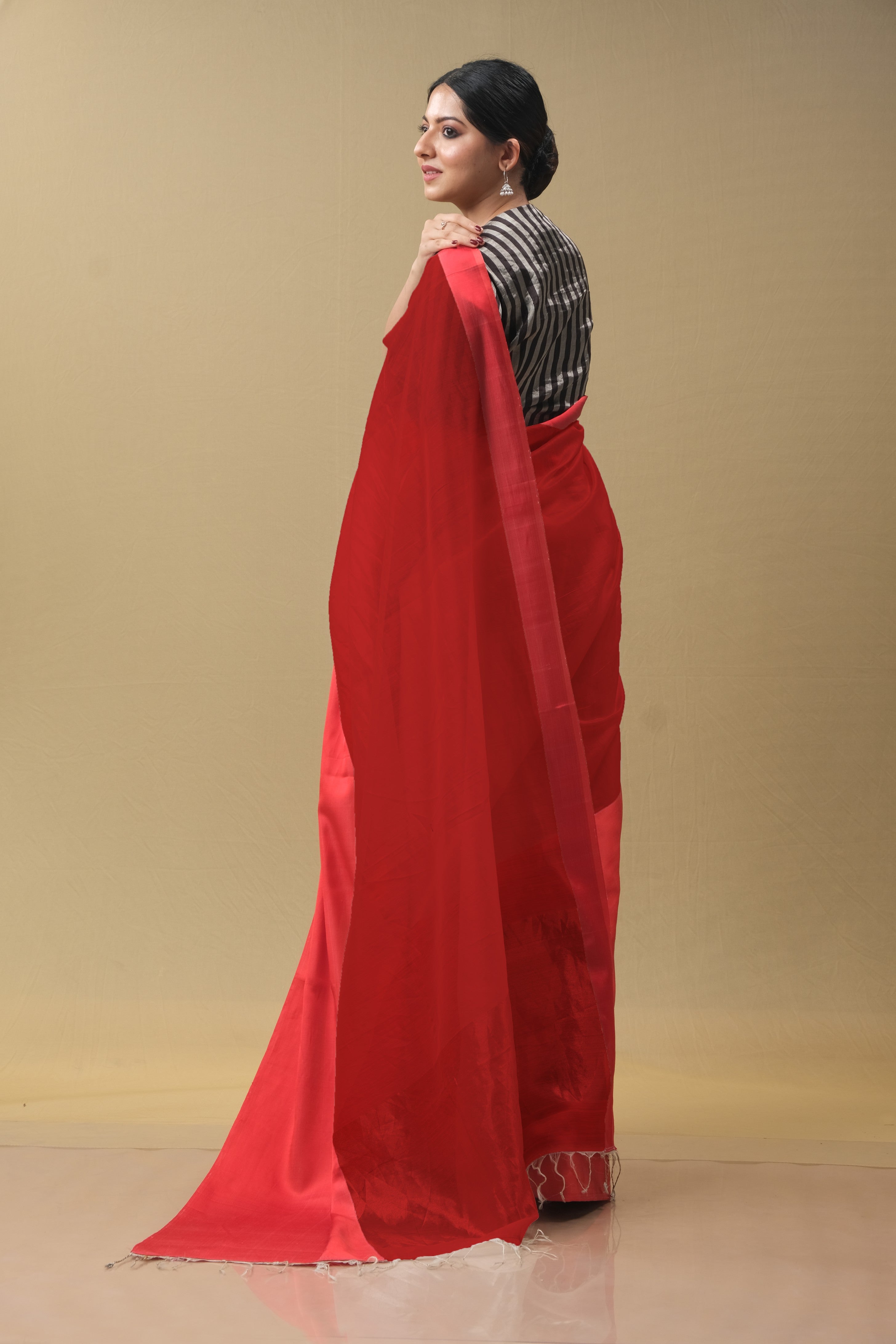 Elevate your ethnic wardrobe with this striking red cotton silk saree, a harmonious blend of comfort and elegance. The lustrous red silk border frames the piece with refined sophistication, creating a polished silhouette perfect for festive occasions and celebrations.