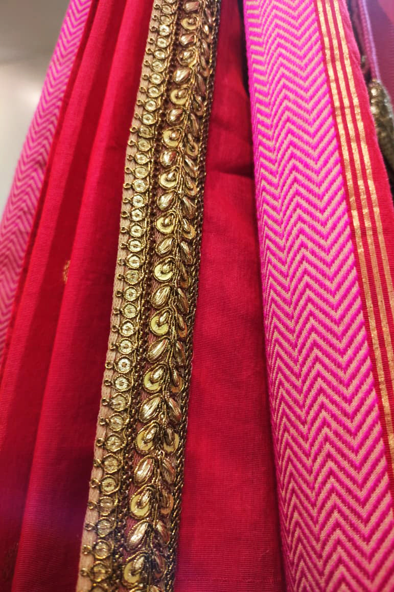 Wrap yourself in timeless elegance with this stunning red cotton silk sari, where tradition meets a touch of sparkle! The rich crimson fabric drapes beautifully, while the intricate golden lace border adds just the right amount of glamour to make you shine at any celebration. Perfect for weddings, festivals, or whenever you want to feel absolutely fabulous. This versatile piece is your go-to for creating show-stopping looks that blend classic charm with contemporary flair.