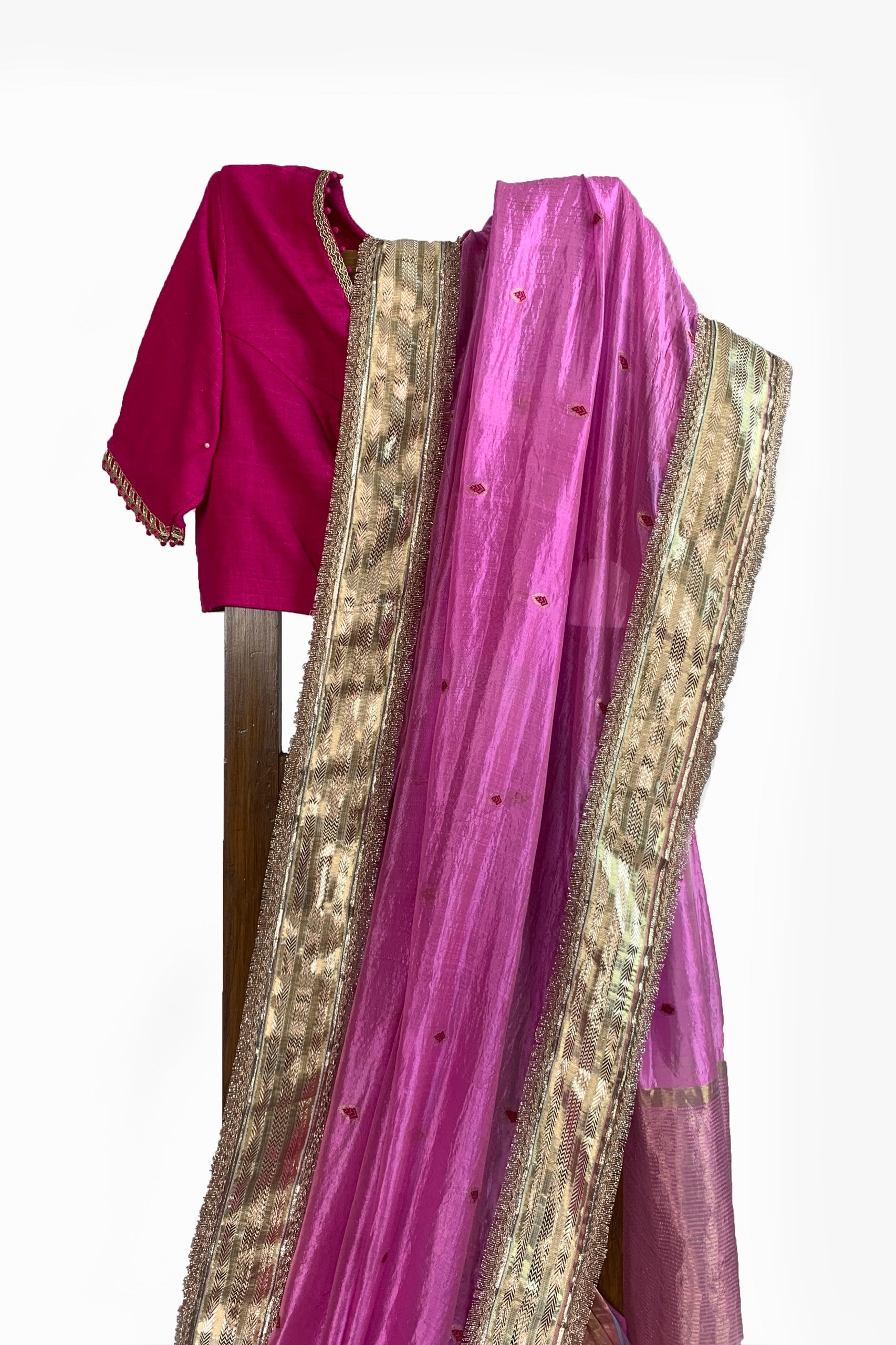 A soft chanderi silk in a sweet pink color with a rich gota border. Body has small red buties, handwoven. Blouse is running pink silk with gota border for sleeves.