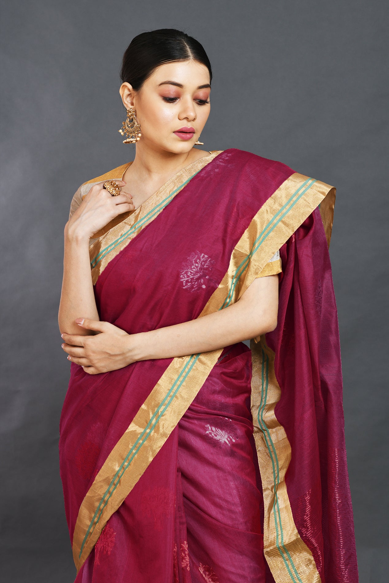 A unique and beautiful 'tree of life' buti on an untraditional wine color base in silk cotton, this saree is all kinds of love. Sway in this beauty in any occasion be it a casual lunch, dinner or a wedding function.